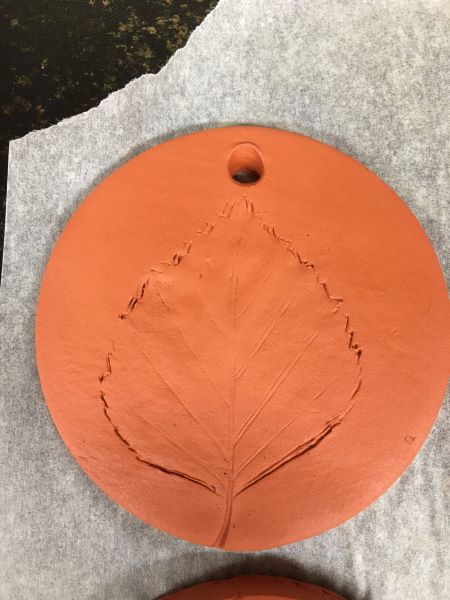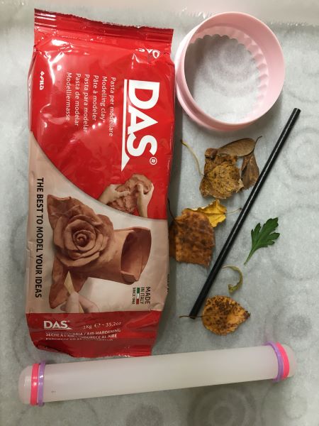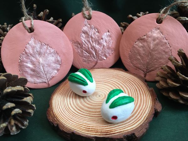 Paper straws come in handy for making a hole to loop some twine through on hanging decorations. You can squeeze out any clay that gets caught inside the straw fairly easily and reuse the straw and clay. Use a tiny bit of water to smooth out the surface of the clay and to help make any impressions you are going to add using leaves or stamps clearer. Keep a bowl of water handy and dip the tip of your finger in it whenever you want to smooth out rough edges, add new details or keep the clay from drying out as you work. You can brighten up your decorations with some acrylic paint once they’re dry or just leave them as they are for a more rustic look.