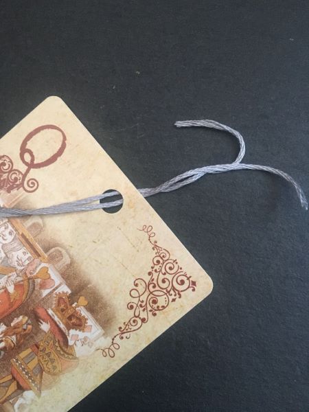 Step 4: Fold your ribbon, thread or twine in half and, holding both ends together, pass the middle of your stringing material (where it is folded) through the hole, so that you have a loop dangling through one side of the card and the ends of your stringing material are on the other.