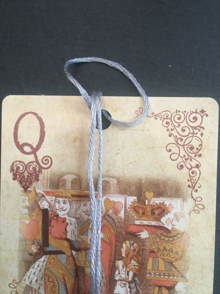 Step 5: Take the loop of your stringing material and, still holding the ends together, bring the loop over the top of the card and thread the ends of your stringing material through it to form a simple lark’s head knot at the top of the card.