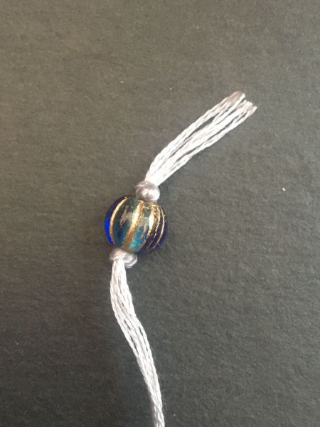 Step 6 (optional): Decide where on your stringing material you want your beads to go. Make a knot just before that point, to hold your beads in place. You may need to make a few knots in that spot if your beads have a large hole and your are using embroidery thread.