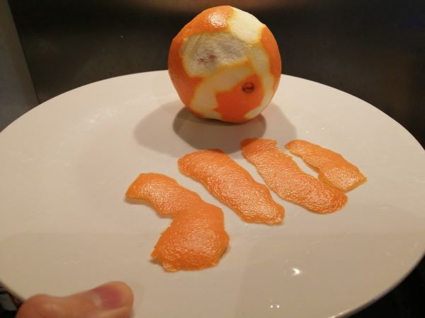- Using the palm of your hand, roll an orange on a surface to help release the oils, then using a small knife or potato peeler, remove 5 long strips of orange peel, squeeze the peel with your fingers, and add to your milk.