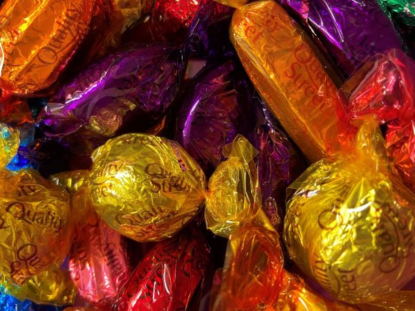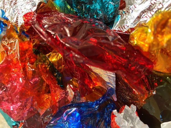 One of the best things about this activity is you get to eat the Quality Street chocolates! The cellophane wrappers are perfect but cellophane sheets work just as well.