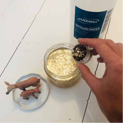 Next (my favourite part!) add a pinch of glitter (or a lot!) and just a dash of glycerine – this magic ingredient will slow down the glitter’s descent. Be careful not to add too much otherwise the water will turn gloopy and glitter will stick to the jar. Finally, line the rim of the jar with glue and carefully screw on the lid making sure it’s tight. The glue should give the jar a nice, snug watertight seal.