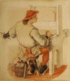 In the current exhibition Standardization and Deviation there is a work by Ford Madox Brown called ‘The Weaver’. As a weaver myself its historical nature fascinated me, because I recognised it depicted a domestic / cottage weaver. The drawing was produced in 1887 and by then, small- scale domestic weaving would not have been as common place as it once was, largely because of competition from industrialisation of weaving, due to the invention of the power loom.