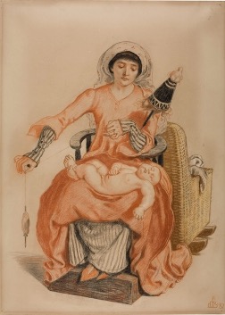 ‘Spinning’ (not currently on display) depicts a female homeworker and reflects the gendered textiles roles common in the pre-industrial age; it was mainly women who spun yarn and men wove the cloth. In the drawing the woman uses a drop spindle to spin the fibres in her right hand and the larger object is a distaff, which holds the raw fibres of cotton. Spinning was something women could stop and start and fit around childcare and the other household duties that mainly fell on them to do. It’s where the pejorative word ‘spinster’ comes from to denote an old unmarried women, a term that was still used officially on documents up until 2005.