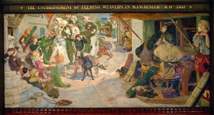Many people are familiar with the history of Manchester’s wealth built on the cotton industry, though its weaving past begins hundreds of years before then, when Manchester was only a village. Weaving was said to have been brought to Manchester by Flemish weavers in the 14th Century, making cloth in wool and linen. In his mural ‘The Establishment of Flemish Weavers in Manchester A.D. 1363’ Madox Brown uses some artistic licence and creates an idyllic scene with a visit from Queen Phillipa of Hainault, wife of Edward III. At this time Manchester was part of land which belonged to her son John of Gaunt, Duke of Lancaster, and she was said to have been the reason for the introduction of Flemish weavers to England.