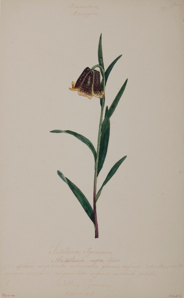 It’s a small but tall sculpture of a purple flower. The flower head hangs down and open.