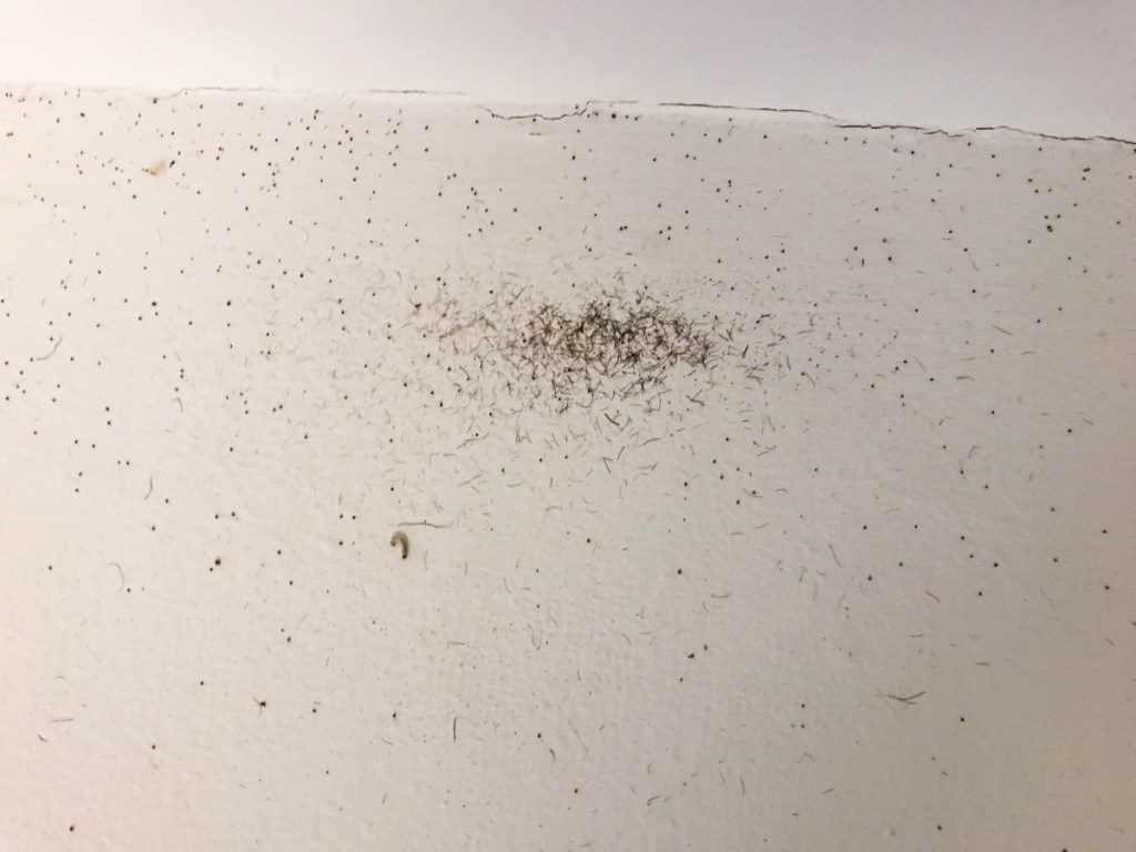 When the Whitworth’s own Collections Care and Access team returned to the gallery in February, a small pile of frass (essentially moth excrement) was spotted underneath an Afghan War Rug on display in our Standardisation and Deviation exhibition. On closer inspection, not only were live larvae discovered, but the pattern of damage on the rug suggested that the activity had started while the rug was rolled, therefore while it was in storage before being on display in the gallery.