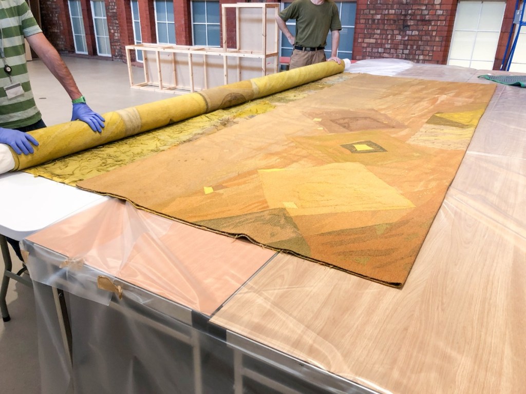 The last and largest textile to be rolled was The Elements, designed by Hans Tisdall, which measures a whopping 533x389cm. On long-term loan from the University’s own collection, this tapestry was created to hang in the UMIST chemistry building, which is now the Faraday Building of the University of Manchester.