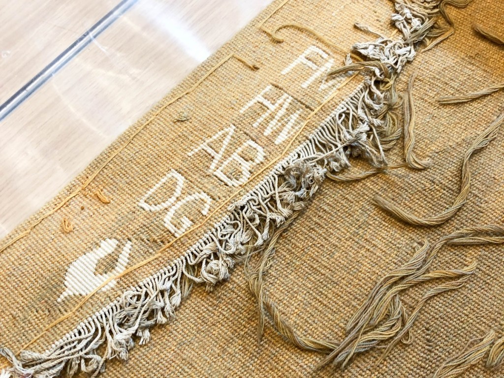 While rolling this gargantuan piece, we discovered not only that the dust build-up in a chemistry building is considerable, but also the initials of the weavers. The tapestry was made by Dovecot Studios in Edinburgh, and the initials included ‘AB’ – meaning Archie Brennan, one of the most influential tapestry weavers of the twentieth century.