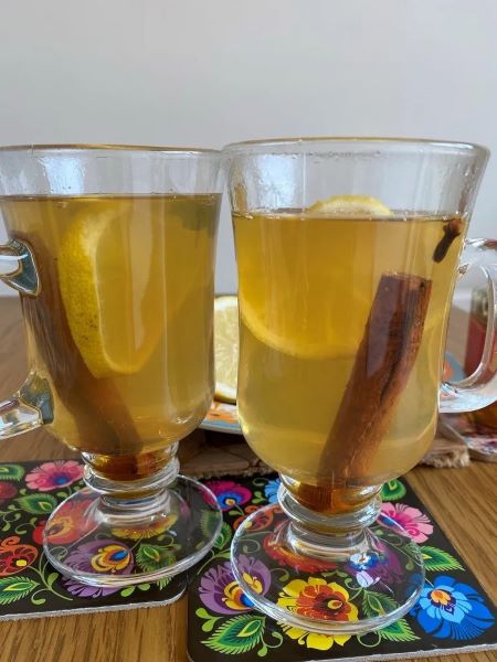 Add a cinnamon stick and slice of lemon. Give the drink a good mix and add an additional squeeze of lemon juice if you want.