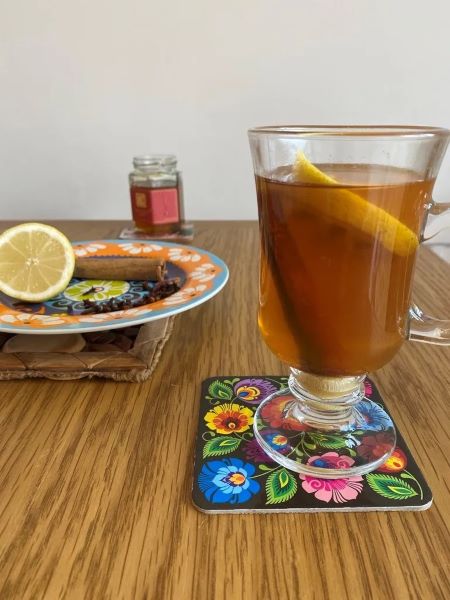 The non-alcoholic version is just as warming and tasty. You’ll notice it has a darker colour due to the tea. Try sticking the cloves in the slice of lemon if you don’t want to eat them. – Matthew