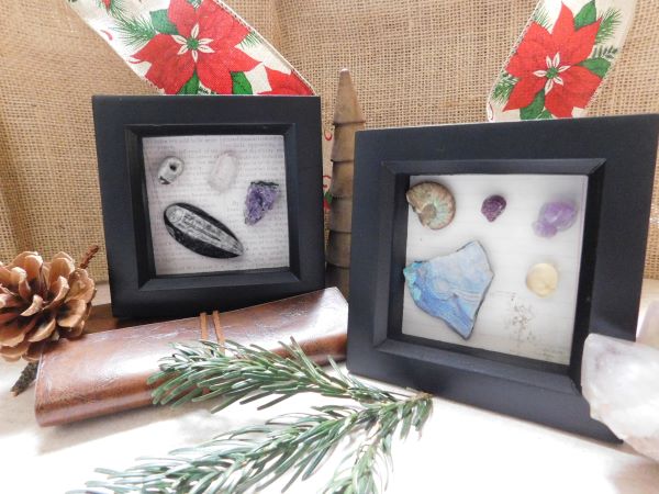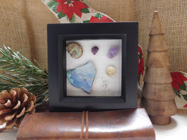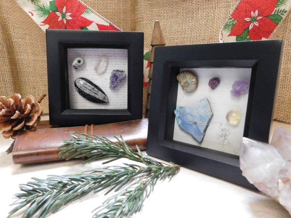 - You curios/ treasures- I used little tumblestones and a plastic animal figure small enough to fit inside a shadow box frame with the glass in place.