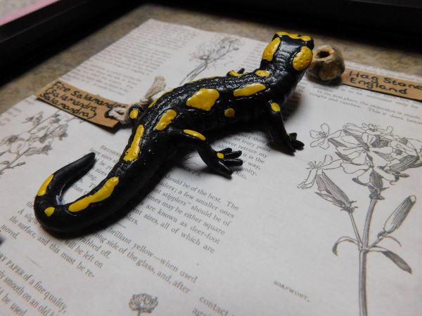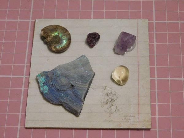I used hot glue to attach the garnet tumblestone, hag stone and a salamander figure (for a bit of faux taxidermy!) and some artificial leaves to the backdrop of the larger shadow box frame. I used a glue dot on the back of each little piece of card/ label to attach the labels to my backdrop. Mod Podge was used to attach the smaller piece of card bearing a different design to the main backdrop. I used a pencil to draw small dots on the backdrop where the corners of the smaller piece of card were to be placed. This helped to act as a guide for the placement.