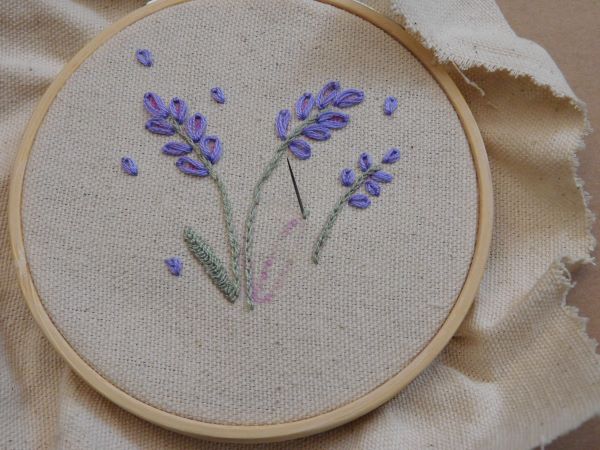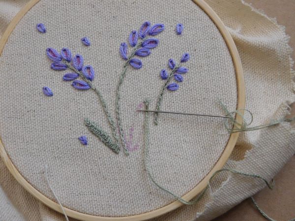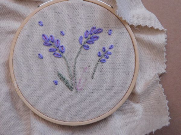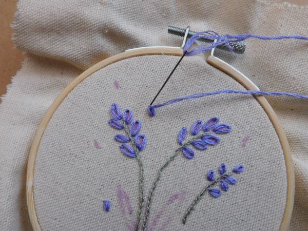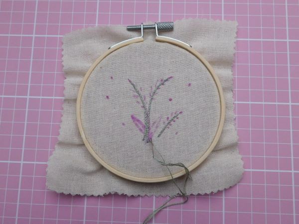 In order to create the stems of the lavender, I used split stitch. In order to create a split stitch, first insert your needle through the back of your fabric and do one normal stitch. Insert your needle into your fabric from the back again, this time bringing it up through the stitch you just created, and sew another stitch in the direction you want to go. Carry on like that and soon you’ll have a lovelylavender stem!