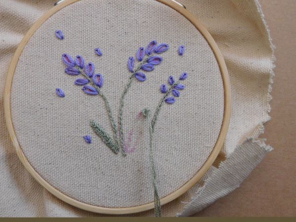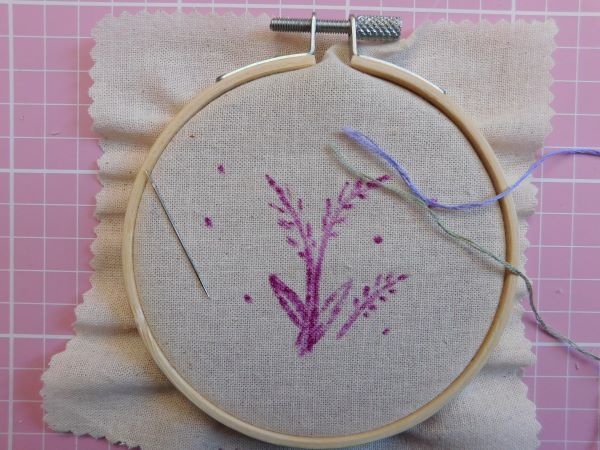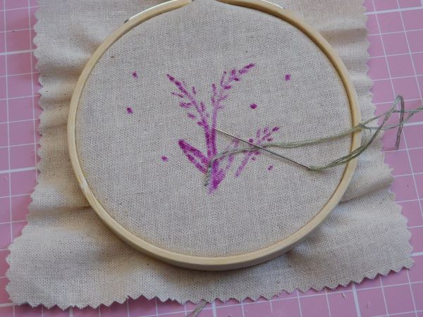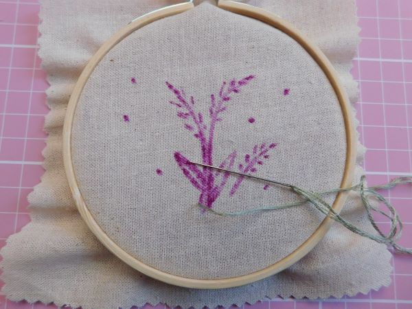 Cut a small length of embroidery floss in your chosen colours and divide the strands to the thickness you want. I used three strands of embroidery floss for the stems of the lavender design I wanted to stitch. I used four strands of floss for the lavender flowers.