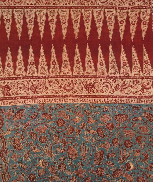 Different surface designs were stencilled onto the cloth with charcoal, then drawn by hand using a bamboo tool called a ‘kalam’ using different water based mordants (such as iron and alum). The patterns created were often small and intricate. The mordants allowed natural dyes to fix to the fabric and were applied evenly to the surface of the cloth. Buffalo milk was also used as a coating on the surface to prevent the colours bleeding.