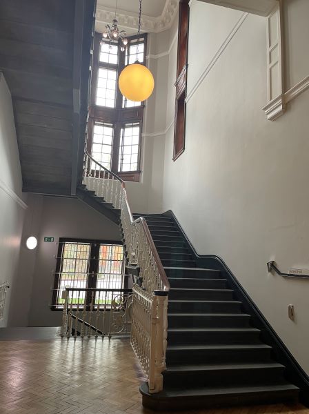 These features can also be found in the Alex Bernstein Garden, which you can access via our ‘second grand staircase’ made from Purbeck stone. It was built on the opposite side of the gallery to our ‘grand staircase’, which was built in the first iteration of the gallery, as the architects wanted to build something to balance the building and honour the grand staircase itself. Another feature you’ll find here is the colourful sculpture hanging from the ceiling, this is David Batchelor’s ‘Plato’s Disco’. Batchelor is a Turner Prize nominee who was commissioned to create this piece specifically for this space. In the autumn and spring, during the late afternoon, the sunlight comes through a window at the top of the sculpture- reflecting off the colour panels and filling the whole staircase with different colours, something I recommend trying to catch!