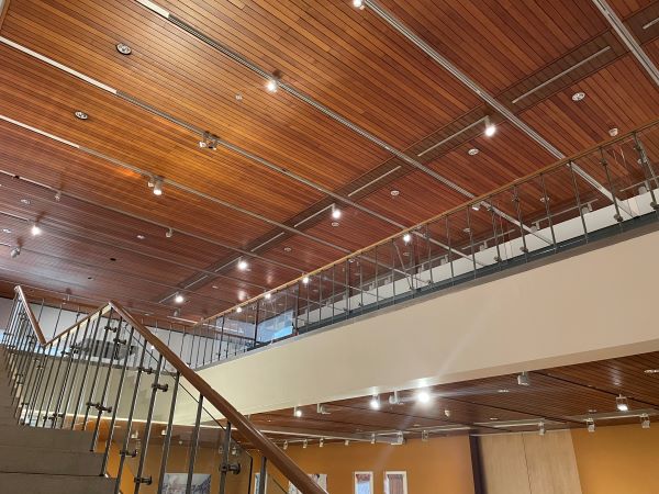 Moving further into the gallery from Gallery One, you can see that the gallery has a distinctly different feel from the first gallery and foyer, that’s because this section of the gallery was renovated in the 1960s. With Scandinavian architecture being in fashion at this time, it was decided to renovate this section in a ‘Scandi style’. In the 1960s Architect John Bickerdike designed a Scandinavian space within the centre of the gallery, with the aim of creating a calming and warm environment, lowering the ceilings and adding timber frames creating a warmer and more intimate atmosphere. In addition to this, Bickerdike added two new windows in the North and South galleries (the south window has since been closed). Bickerdike used wood which originated from Scandinavia in his design and as a result this section of the gallery is listed and has a number of restrictions on it. This is why the new extension of the gallery does not intrude into this section of the gallery.