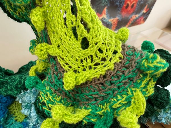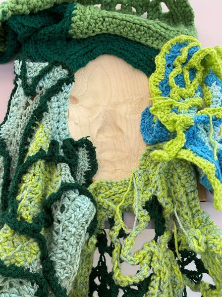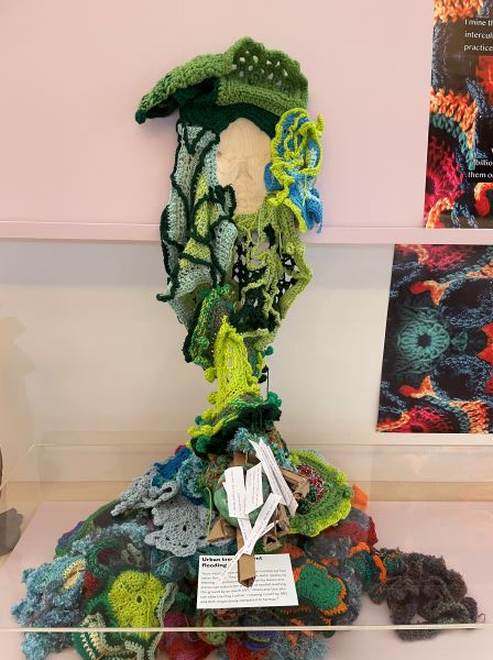 The project here at the Whitworth is an opportunity to understand at the core a way to use my creativity to enhance my understanding around climate change emergency and justice. How as an artist I can amplify the message as a climate activist. So the crochet has developed by becoming sculptural and feeding into a character called Entwife. The Entwife comes from the ‘Lord of The Rings’- the Ents are the large trees that appear and carry the hobbits at the end battle, only referred to in the book, but not seen in the film. The entwives are busy serving and looking after the earth. So the storytelling and the character building is an important part in our conscious to stop us wanting to know and we can get into our heart building. That is how am I going to build my true relationship with justice and action through the developing of Entwife for we all need to be activists. This new initiative of creating change in a gallery through crochet.