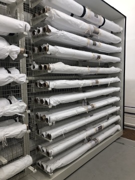Our previous storage system was full, with no room for many of the more recently acquired textiles, and could not store any works over five metres in width, of which we have quite a few. The space was difficult to manoeuvre long rolled textiles safely, as you have to keep them horizontal and avoid brushing the roll against any nearby objects or shelves. It was also tricky to locate an item, with over 100 textiles charted as a single location and, due to the space restrictions, no categorisation of the textiles.