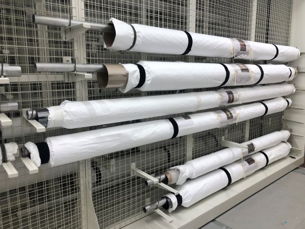 The new system also allows the support arms that hold the textiles to be placed anywhere along the racking, which allows great flexibility for the wide range of textiles we have in the collection. Above, you can see how the storage is really maximised for textiles of approximately the same width, and below, the larger tapestries of different sizes are also catered for. These heavy textiles are supported by a metal pole to prevent bowing of the cardboard tube they are rolled onto.