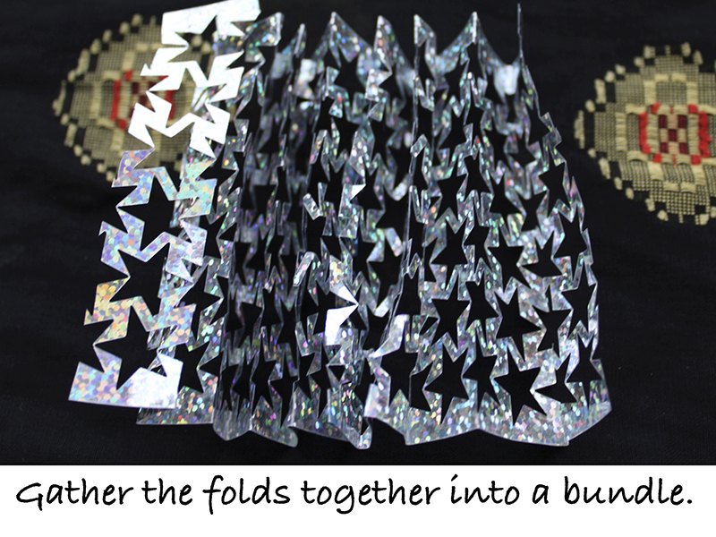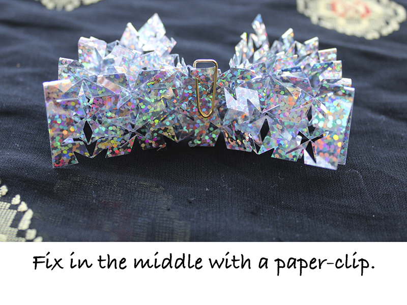 All you need is a pair of scissors, some sequin roll from the Whitworth Shop of Creativity, and paperclips, (or sellotape, or a stapler) plus embroidery thread or twine.