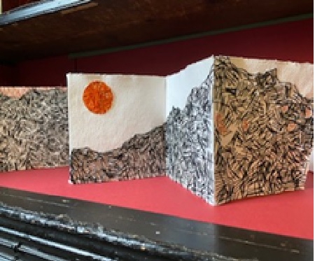 Directly below this sit Suman Gujral’s three works, ‘The Sun Never Sets’, ‘Routes’ and ‘River.’ Gujral is responding to the infamous address by MP Enoch Powell, known as the ‘Rivers of Blood’ speech; the layout of each piece as a rectangular concertina suggesting a fluidity of movement.3