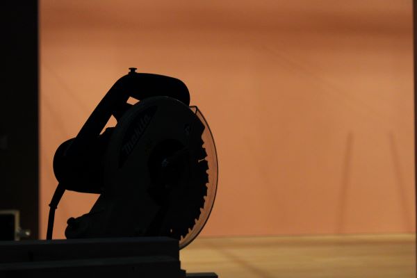 0330- The shadow of what looks like a fan is potentially equipment to saw wood. When making a new exhibition, the design team make cabinets or shelves bespoke so heavy equipment is sitting quietly when not in use