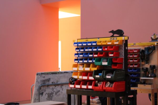 0354 – These colourful square hold tools the team use to do all the practical design aspect of making. New gallery space. The mouse on top is to differentiate from a very similar looking toolbox but with a different figure on top.
