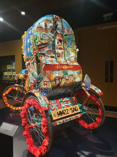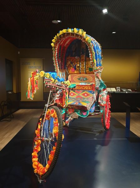 Museum interpretation: Made in Dhaka, Bangladesh, this rickshaw is one of two that were commissioned by Manchester Museum. Three British artists, Daya Bhati, Saheba Shabnum and Helen Abdul, decorated the vehicle under the mentorship of Bangladeshi rickshaw artists, Syed Ahamed Hossan and Z.A. Saleh Zebermi. The rickshaw art was inspired by conversations about shared themes of culture, heritage and identity between South Asian communities in the UK and in South Asia. The international partnership was facilitated by the Uronto Artist Community.