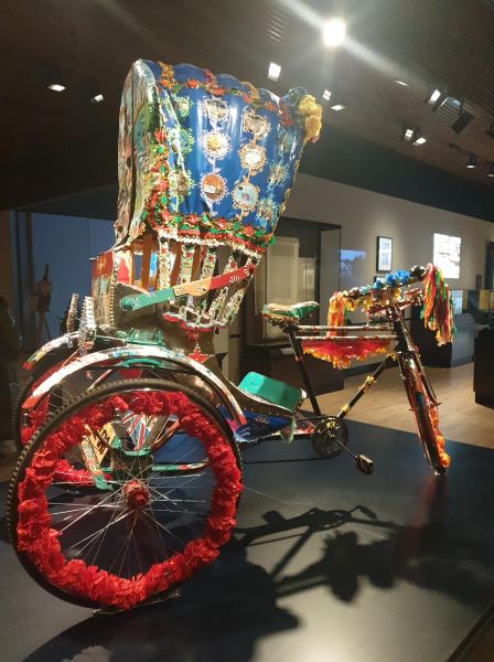 During my trip to the museum, I explored their new and permanent South Asia gallery. Beautifully curated, the space explores South Asian and British Asian culture and celebrates the experiences and contribution of the South Asian diaspora. While all the objects told a story, I was particularly drawn to the vibrantly decorated rickshaw on display. When I saw the rickshaw, I was reminded of my travels some years back in north east Bangladesh. I remember my cousin, hailing two down for our party of four, the rickshaws were similarly decked out in bright colours and popular culture references. Gripping onto the side of the rickshaw, we weaved through the bazaar under a burgeoning sun. The rickshaw rider in his flip flops, rode the waves of noise, smell, people and animals that passed us by, and like threading a needle, would glide through the smallest gaps in the crowds, and come out the other side unscathed.