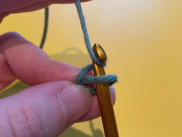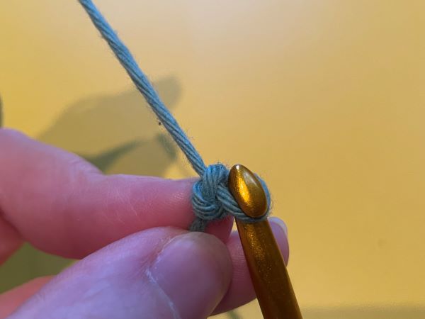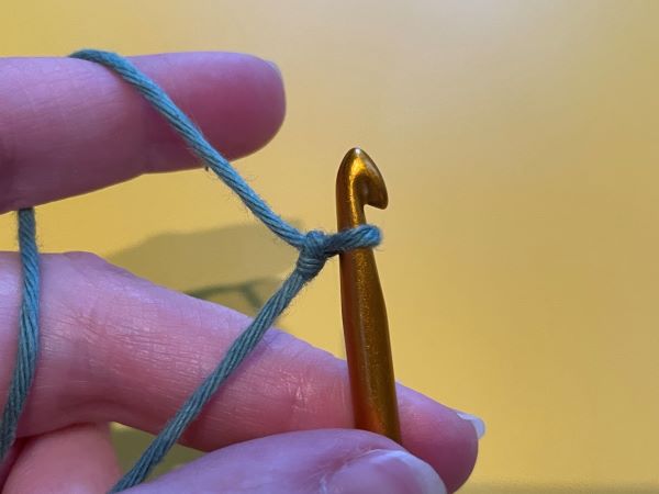 Start with a slip knot. There are various ways to do this but I make a loop of yarn pinched between my thumb and index finger on one hand and then pull the working (the long end closest to your skein of yarn, not the tail end) through the loop with my crochet hook, then pull another loop through the loop you have just pulled through and pull on the tail end to tighten the knot.