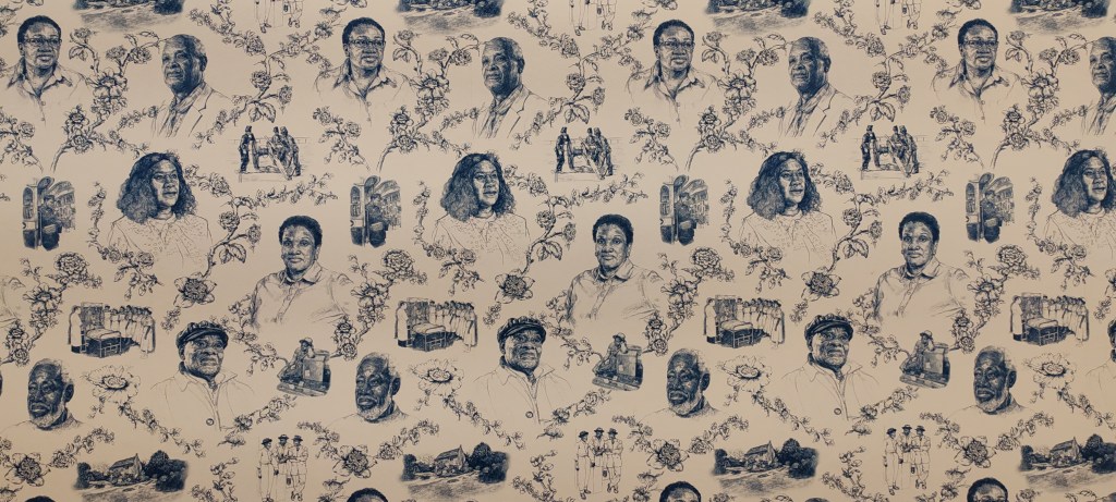 In her wallpaper commission ‘Soft Power’, Walker reclaims the historical soft power of Toile through countering the design’s conventional imagery of European figures with Caribbean diaspora, celebrating six first and second-generation Windrush migrants from Manchester.
