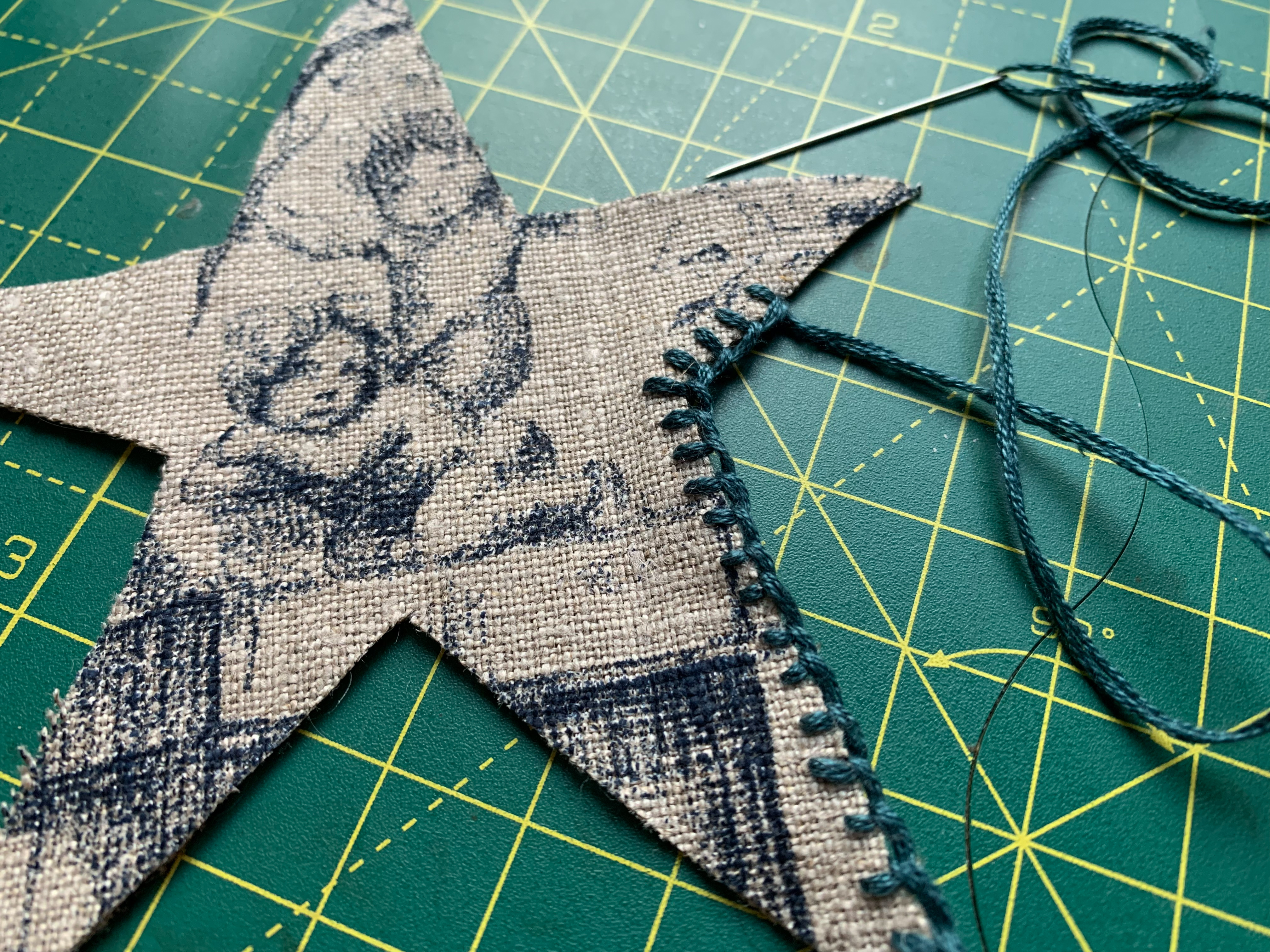Thread your needle and knot the tail end. Start by sending your needle up from inside the two shapes. At this point, you can either do a running stitch or a blanket stitch.