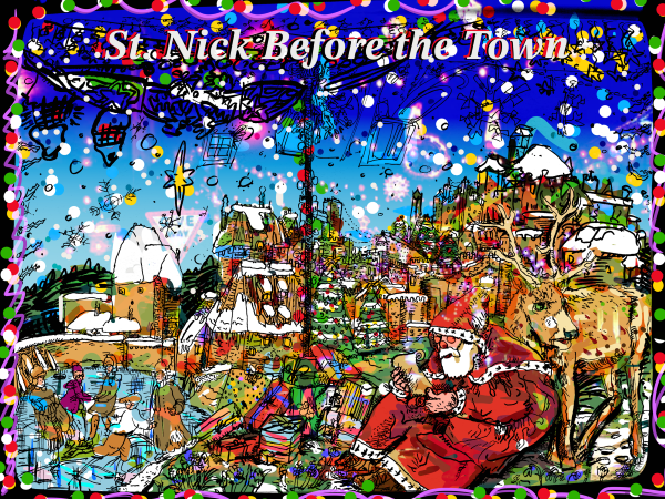 Drawing is the most relaxing when you don’t have to think too hard and this is made easier by just copying pictures that already exists. In this picture here I’ve reworked Dürer’s ‘St Anthony the Hermit’, or ‘St Anthony Before the Town’, to embody the spirit of Christmas. It already struck me as quite festive – a bearded figure in a long coat and pointed hood, sat before a German castle town certainly isn’t an odd image to see on biscuit tins and greetings cards around this time of year. All I really had to do was add some string lights, presents, a reindeer and a sprinkling of snow and we’re there!