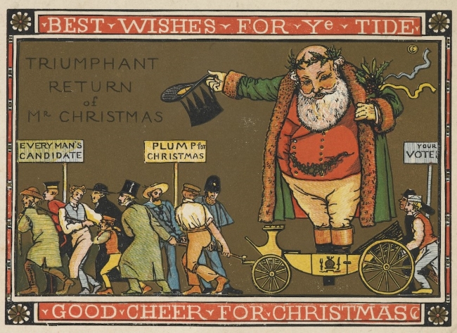 Let’s now take a look at some images from the Whitworth collections. They are by the artist Walter Crane, and are very characteristic of the Arts and Crafts movement. In these three images you can see different incarnations: St Nicholas the saint and protector of children, a personification of December clutching a Christmas tree and wearing more luxurious furs and a classic Dutch pilgrims’ hat, and jolly man-of-the-people Mr Christmas with his crown of holly leaves. Folk figures and traditions like Father Christmas were beloved by Crane and his ilk, and comparing Crane’s images side by side you can really see how the English in the late 19th century took the New Yorkers’ Santa Claus and saw so many similarities in their own personification of Christmas.